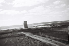 "Fotografia em preto e branco, no formato paisagem. Imagem aérea da Praça dos Três Poderes e dos monumentos componentes da praça. A imagem enquadra o Palácio do Congresso, o Palácio do Planalto, o Museu Histórico de Brasília, o Palácio do Supremo Tribunal Federal e o terreno delimitado para a praça.