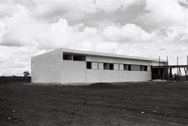 "Fotografia em preto e branco, formato paisagem. Em primeiro plano, chão de terra batida. Um edifício longilíneo não identificado em fase de construção com revestimento de alvenaria e janelas em fita. À direita, construção de uma marquise e figuras humanas estão atuando na construção do mesmo. Atrás do edifício, nos cantos direito e esquerdo, nota-se vegetação de cerrado típico (cerrado sentido restrito). Continuação da fotografia item NOV-D-4-4-B-20’ (28).