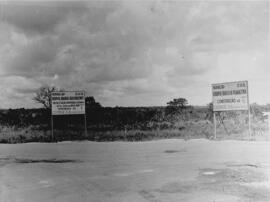 Fotografia preta e branco em formato paisagem retirada em outubro de ano desconhecido entre 1957-1960. Registro das placas de identificação de parte de um trecho das rodovias Brasília-Belo-Horizonte e Brasília-Planaltina – hoje identificadas como BR-040 e a EPIA (DF-003) –, durante os primeiros anos da construção de Brasília (1956-1960). No quadrante inferior, em primeiro plano, a estrada ainda sem pavimentação, apenas terraplanada, com resquícios de materiais e passagem de pneu dos veículos e maquinários. No registro, as placas retangulares de madeira estão sustentadas por uma estrutura simples de ripas de madeira às margens trechos da Rodovia Brasília-Belo Horizonte e Rodovia Brasília-Planaltina, ainda em fase de obra na época da construção, em que se lê, na placa esquerda, as inscrições: “NOVACAP D.V.O. Rodovia Brasília - Belo Horizonte. Trecho Estação Rodoviária-Luziânia 47 km (20 km em pista dupla) Construção de Coenge S.A. Engenharia e Construções”; e na segunda placa: “NOVACAP D.V.O. Rodovia Brasília-Planaltina - Construção de Coenge S.A. Engenharia e Construções”. A construtora identificada nas placas trata-se da Coenge S.A. que, junto da Companhia Metropolitana, realizaram a terraplanagem do Aeroporto definitivo de Brasília. A placa identifica trechos de construção do que hoje é a BR-040” faz parte de um grande sistema rodoviário que contempla os Estados de Goiás, Minas Gerais, Rio de Janeiro e o Distrito Federal [...]. Possui extensão superior a mil quilômetros, e faz ligação entre as capitais brasileiras.” (Santos; Gomes, 2015, p. 16). As placas, muito utilizadas no período inicial da construção de Brasília, auxiliaram muito a localização por parte das autoridades e operários que chegavam ao ambiente de obra. Dada a distância das obras, as placas informativas contribuíram de forma fundamental para orientar a difusão do conhecimento dos canteiros e monumentos em construção (Guia Brasileiro de Sinalização Turística, 2007). Em plano de fundo, às margens da via, a vegetação se faz evidente, e pequenos aglomerados de terra separam a vegetação da estrada. Ao fundo está uma vegetação de cerrado típico (cerrado sentido restrito), que se estende pelo horizonte.