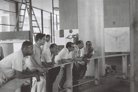 Fotografia em preto e branco no formato paisagem. Fotografia caputra Oscar Niemeyer (1907 – 2012), Lucio Costa (1902 – 1998) e outros homens não identificados acompanhando a transferência da obra “Maternidade” ou “Mãe” do artista modernista Celso Antônio (1896 – 1984) do Palácio Capanema, Rio de Janeiro. Em segundo plano, observa-se que o edifício passa por manutenção, enquanto alguns painéis com imagens de Brasília sugerem uma exposição. O antigo Ministério, hoje conhecido como Edifício Gustavo Capanema, Palácio Gustavo Capanema ou Palácio Capanema, foi idealizado e construído entre 1936 e 1943, durante o governo de Getúlio Vargas (1882 - 1954), na gestão do ministro da educação Gustavo Capanema (1900 - 1985). Foi projetado por uma equipe composta por renomados arquitetos como Lucio Costa (1902-1998) e Oscar Niemeyer (1907-2012) e é repleto de obras de artistas que buscavam enaltecer a identidade nacional. Lucio Costa aproveitou o momento de manutenção do edifício para autorizar a retirada da escultura do local. Em seu lugar, foi colocada outra obra do artista, a escultura “Mulher Reclinada”, que originalmente estava no jardim do Palácio. Posteriormente, a estátua “Maternidade” foi transferida para a praça da praia de Botafogo, próxima a igreja Imaculada Conceição no Rio de Janeiro, onde se encontra atualmente.