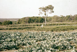 A plantação de couve em primeiro plano ocupa a metade da parte inferior da fotografia. Um caminho de terra separa as couves de outra plantação de possivelmente pimentões e um pé de milho no centro. Acima, plantação de alface, e mais ao fundo uma plantação de tomates sustentados por gravetos. Há uma árvore alta entre os tomates e alface.