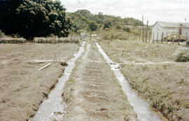 Fotografia formato paisagem, colorida. Em destaque na imagem canais de irrigação de área de plantio. No lado direito da fotografia uma edificação e um automóvel. Em 6 de fevereiro de 1957, por resolução do Conselho Deliberativo da Novacap, foi criado o Departamento de Terras e Agricultura – DTA. As atividades do DTA foram iniciadas com a demarcação de 30.000 hectares, para atender os agricultores que chegavam em Brasília. A área foi dividida em núcleos rurais e colônias agrícolas, localizadas às margens de ribeirões perenes, subdivididos em lotes de 5 a 50 hectares para agricultura, podendo atingir até 100 hectares para pecuária, preferencialmente pecuária leiteira. Os primeiros lotes rurais arrendados foram os dos Núcleos Rurais Vargem da Benção e Vargem Bonita.