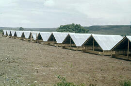 O objeto principal da fotografia são os poleiros A foto está angulada , com o ponto de fuga localizado a esquerda da imagem que apresenta uma sequência enfileirada de galinheiros. Em primeiro plano estão estes galinheiros sobre solo sem vegetação, a luz é diurna e a fotografia de um ambiente externo. Atrás dos galinheiros há um pouco de vegetação e uma árvore, talvez uma mangueira, e mais atrás campo limpo em um relevo. Os galinheiros estão localizados na Granja modelo n°3 do torto e são constituídos com estrutura de madeira, apoiados em pedras, cobertura de madeira de duas águas e telhas metálicas.