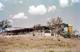 Galpão na Granja do Torto em construção, por volta de 1958-60. Em primeiro plano se vê cerrado desmatado, como indica a terra vazia com rebrotas e algumas árvores preservadas. Na árvore mais à frente, uma termiteira está grudada em seu tronco. Alguns objetos de construção estão espalhados pelo chão, algumas escadas e entulhos de materiais de construção. À direita está um tanque de água cilíndrico e amarelo. À esquerda em segundo plano se enxergam alguns homens que trabalham no local. A estrutura do galpão é de aço sobre vigas baldrame em concreto, coroada pela estrutura da cobertura de madeira com contraventamentos de aço e telhas de zinco, as paredes de alvenaria sendo erguidas, ainda em meia altura.
