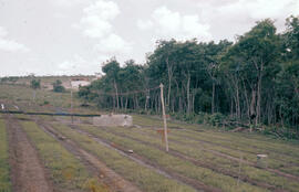 Atrás da plantação das hortaliças e do tanque há presença de um aparente pasto, algumas moitas de árvores nativas.