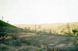 Fotografia colorida, formato paisagem. Terreno desmatado e preparado para o plantio. Observa-se estacas de madeira provavelmente preparadas para serem utilizadas para o plantio. Em 6 de fevereiro de 1957, por resolução do Conselho Deliberativo da Novacap, foi criado o Departamento de Terras e Agricultura – DTA. As atividades do DTA foram iniciadas com a demarcação de 30.000 hectares, para atender os agricultores que chegavam em Brasília. A área foi dividida em núcleos rurais e colônias agrícolas, localizadas às margens de ribeirões perenes, subdivididos em lotes de 5 a 50 hectares para agricultura, podendo atingir até 100 hectares para pecuária, preferencialmente pecuária leiteira. Os primeiros lotes rurais arrendados foram os dos Núcleos Rurais Vargem da Benção e Vargem Bonita.