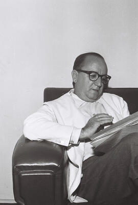 "Fotografia preto e branco, formato retrato. Em destaque, homem não identificado. Ele veste paletó e camisa em tons claros, calça escura e usa óculos. Está sentado em um sofá de couro escuro e lê alguns papéis, sua expressão facial é tranquila. Nota-se que o fotógrafo fez um enquadramento bastante específico pegando apenas o indivíduo da imagem, infere-se que ele está em um ambiente fechado, no último plano aparece somente uma parede clara.