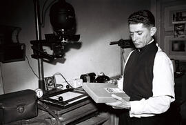 "Fotografia preto e branco, formato paisagem. Em primeiro plano é possível ver um homem, ele veste um tipo de batina e segura uma caixa em suas mãos, ao seu lado se vê um equipamento semelhante à um ampliador sob uma bancada, são vistos ainda alguns outros utensílios como telefone, temporizadores, uma luminária de gabinete e uma bolsa de couro sob a mesa.