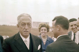 Fotografia colorida, formato paisagem. Em primeiro plano, Israel Pinheiro (1896 – 1973) com terno preto, camisa branca e gravata cinza. Ao seu lado encontra-se um homem de costas, não identificado, e outro que aparece de perfil apenas parcialmente, também não identificado. Em segundo planos estão os filhos de Israel Pinheiro, Maria Inês Uchôa Pinheiro e João Virgílio Uchôa Pinheiro. Os dois estão sorridentes e parecem conversar com os homens que não foram identificados. Em terceiro plano, um grande gramado que compõe o cenário da Esplanada dos Ministérios, mais ao fundo, do lado direito, é possível observar um edifício ministerial. Esta imagem foi capturada durante as festividades da inauguração de Brasília.