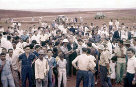 Fotografia colorida, formato paisagem. Em primeiro plano, um grupo de pessoas se aglomera ao redor de Israel Pinheiro (1896 – 1973). É possível perceber homens, mulheres e crianças próximas ou se aproximando da cena. No centro da imagem, encontra-se Israel Pinheiro, vestindo terno escuro com camisa clara, ele observa atentamente o que um operário lhe mostra em uma folha de papel. O operário usa camisa e calça escura, além de um capacete de proteção. Além de Israel Pinheiro, só foi possível identificar José Ludovico de Almeida (1906 – 1989), político e ex-governador de Goiás, ele está do lado direito da imagem, logo atrás de um homem todo de branco que está posicionado atrás de Israel. O grupo retratado é diversificado, composto por homens, mulheres e crianças de diferentes etnias, alguns vestidos com uniforme de trabalho, outros de maneira mais casual, alguns homens de terno. Em segundo plano, mais pessoas se aproximam, enquanto dois trabalhadores negros manuseiam uma máquina. Além disso, compõem o cenário dois grandes cilindros no chão e dois automóveis estacionados, um Jeep branco e um Ford F1 verde escuro. Ao fundo, um terreno descampado, com pouca vegetação, apenas uma escassa grama quase imperceptível nesse enorme lote de terra batida, há também uma estrada de terra que acompanha toda a área.